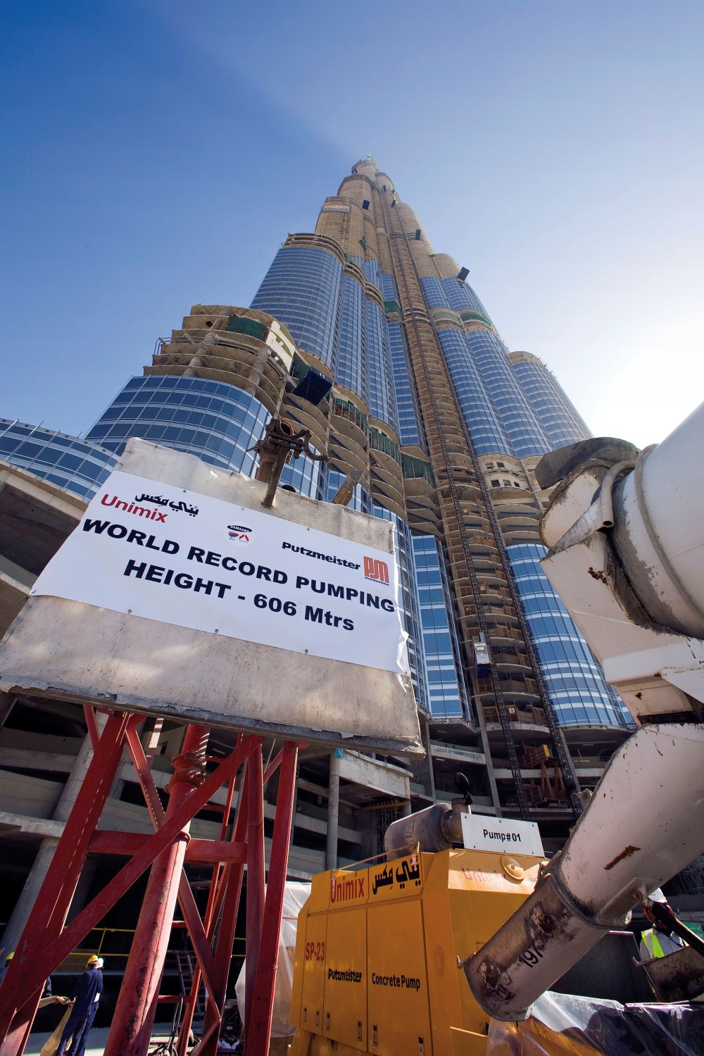 Putzmeister has many years of experience with highrise pumping in challenging projects, from pumping pressures up to 250bar at the world record pumping height of 606m to concrete volumes of more than 150,000cbm.
